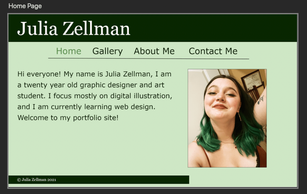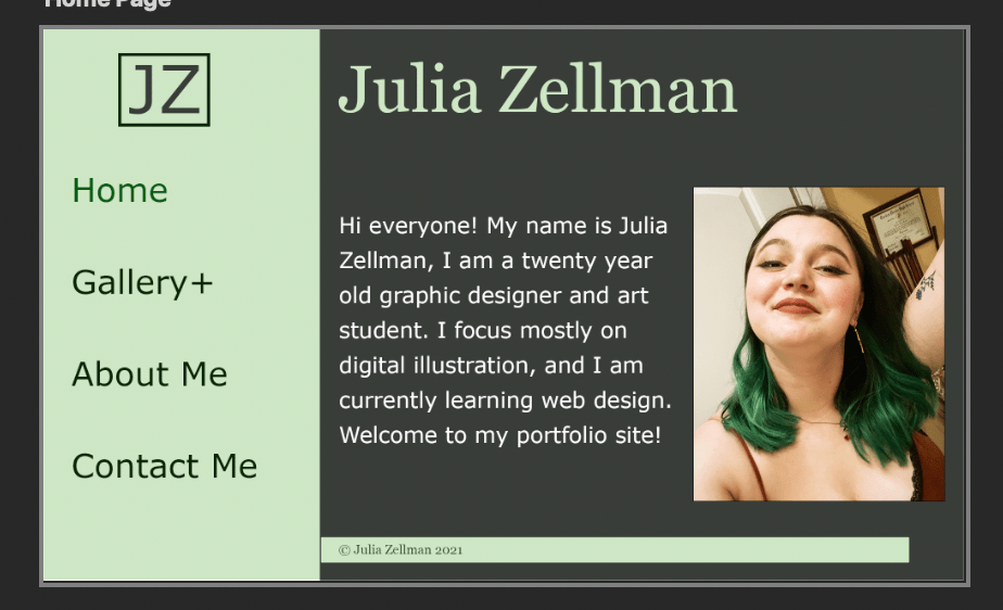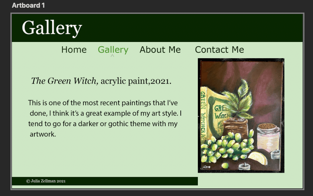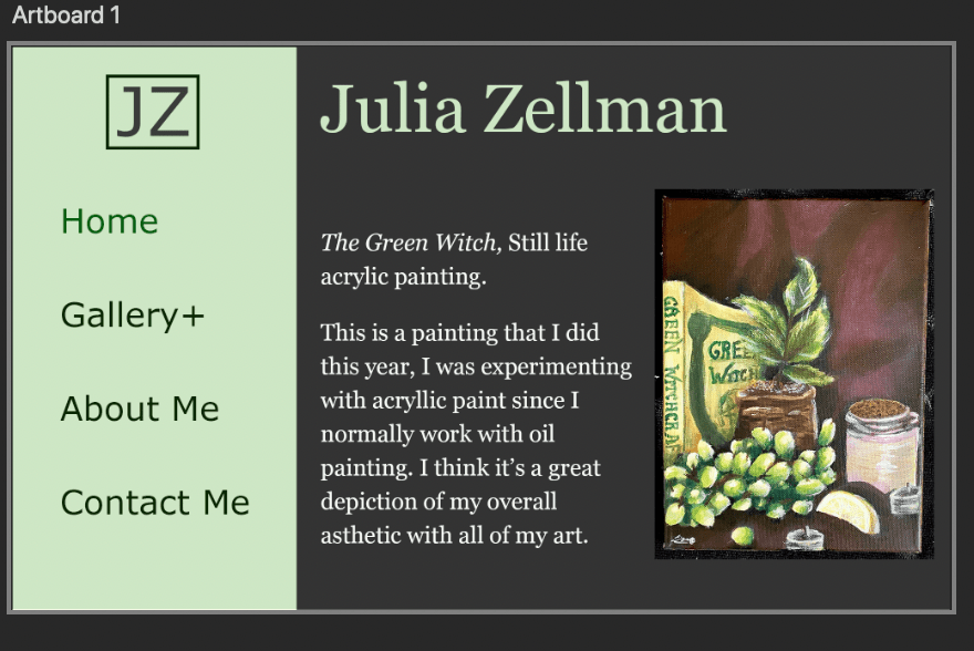 I also got rid of the extra sidebar I had on my gallery page, which showed the different sections of my portfolio. It was confusing and took up too much space on the page. Instead, I plan to just have an extension on my gallery button where you can hover over it and then choose which section of my portfolio to access.